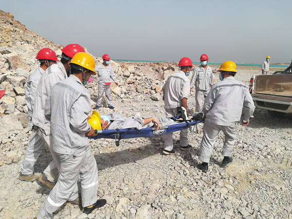 此次演練模擬場景為一名員工從邊坡墜落受傷后的緊急處理過程。接到現(xiàn)場巡視人員報(bào)告后,項(xiàng)目部立即啟動應(yīng)急響應(yīng),隨即通知應(yīng)急救援小組火速趕往事故現(xiàn)場進(jìn)行救援。警戒疏散組拉起了安全警戒線,封鎖事故現(xiàn)場,維持現(xiàn)場秩序;醫(yī)療救護(hù)組檢查傷者情況后,對傷員進(jìn)行了簡單的救治和護(hù)理;技術(shù)處置組進(jìn)入高處墜落現(xiàn)場,進(jìn)行了高處墜落后的安全檢查,預(yù)防次生事故;物資保障組馬上聯(lián)系了醫(yī)院,做好了傷員接收的準(zhǔn)備。各小組各司其職,演練現(xiàn)場井然有序,最后救護(hù)車輛趕到現(xiàn)場,將傷員送往醫(yī)院,演練活動結(jié)束。