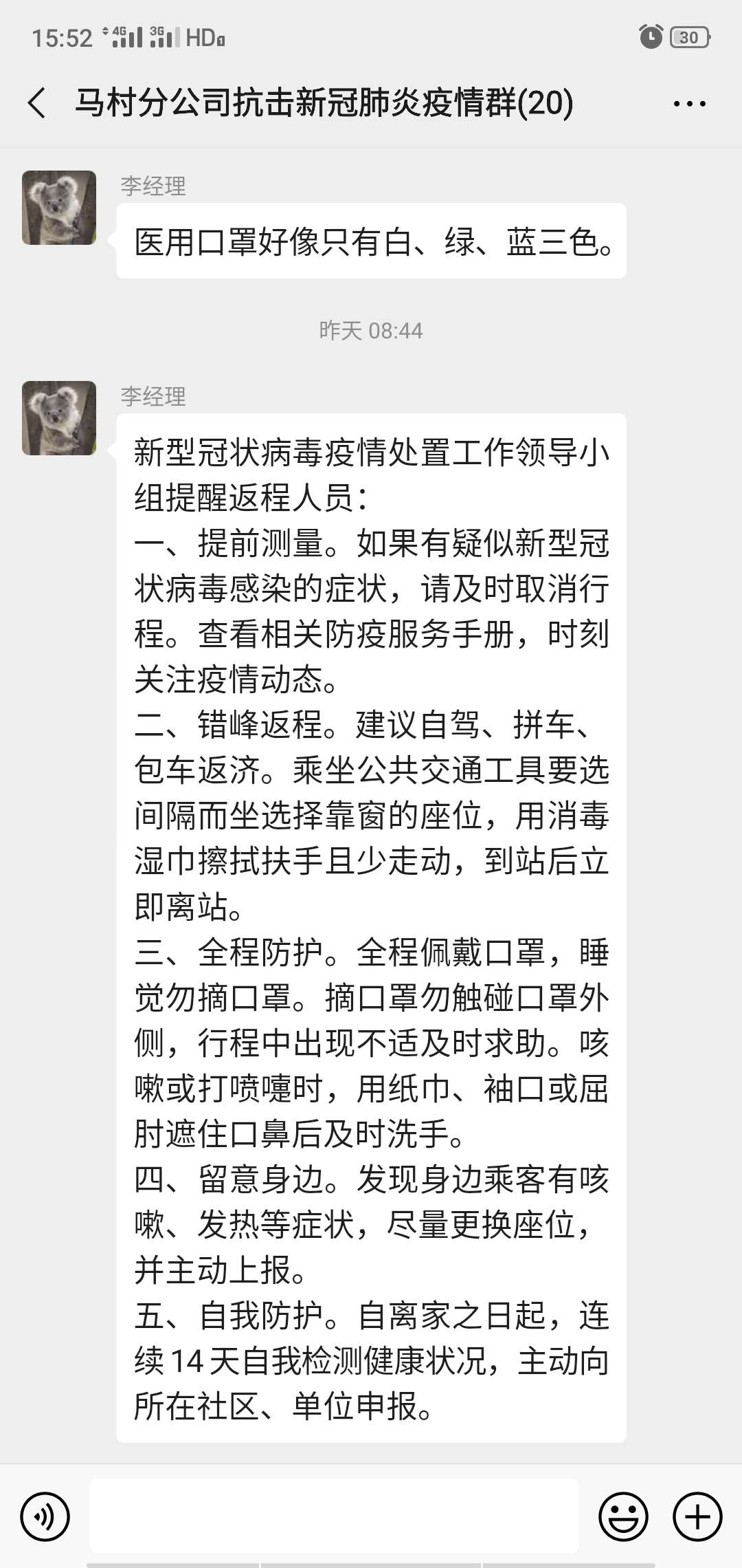 突如其來的災(zāi)難讓本該舉國同慶的春節(jié)變的人心惶惶。為打好這場保衛(wèi)全國人民的硬仗,2020年1月25日前后,全國30多個(gè)省啟動(dòng)重大突發(fā)公共衛(wèi)生事件一級響應(yīng),實(shí)行最嚴(yán)格的科學(xué)防控措施。同時(shí)各地方政府也出臺(tái)相應(yīng)的防控的舉措。 為有效控制疫情的傳播,針對疫情期間的各項(xiàng)工作安排,兗州中材馬村分公司于2020年1月29日成立應(yīng)對疫情工作領(lǐng)導(dǎo)小組。根據(jù)省委、省政府及公司關(guān)于做好疫情防控的重大決策部署,全面落實(shí)分公司的相關(guān)工作要求,負(fù)責(zé)與分公司上級及地方、千業(yè)水泥疫情工作的聯(lián)系,協(xié)調(diào)好疫情期間的人員以及各項(xiàng)工作安排。 假期期間,通過網(wǎng)絡(luò)通訊設(shè)備進(jìn)行安全防疫宣傳教育。  通過宣傳欄、條幅等向員工傳達(dá)疫情防控知識(shí),提高疫情防控意識(shí)。   通過有效途徑采集各類防疫物資,主要包括醫(yī)用酒精、84消毒液、一次性口罩、便攜式噴霧瓶以及測溫儀等。    通過對辦公室、走廊、宿舍以及衛(wèi)生間等公共場所以及公共設(shè)備設(shè)施進(jìn)行消毒,早晚各一次。  分公司門口設(shè)置崗哨,無關(guān)人員禁止出入;對相關(guān)人員進(jìn)行信息登記,對進(jìn)出人員進(jìn)行測體溫并登記,無異常才允許進(jìn)入,如發(fā)現(xiàn)異常及時(shí)上報(bào)處理。  公司員工每天測量體溫,匯報(bào)身體狀況;對于外地返崗人員,按照相關(guān)規(guī)定進(jìn)行相應(yīng)的隔離,隔離期間每天3次匯報(bào)體溫,并接受地方政府及先關(guān)人員的監(jiān)督,確保萬無一失。
