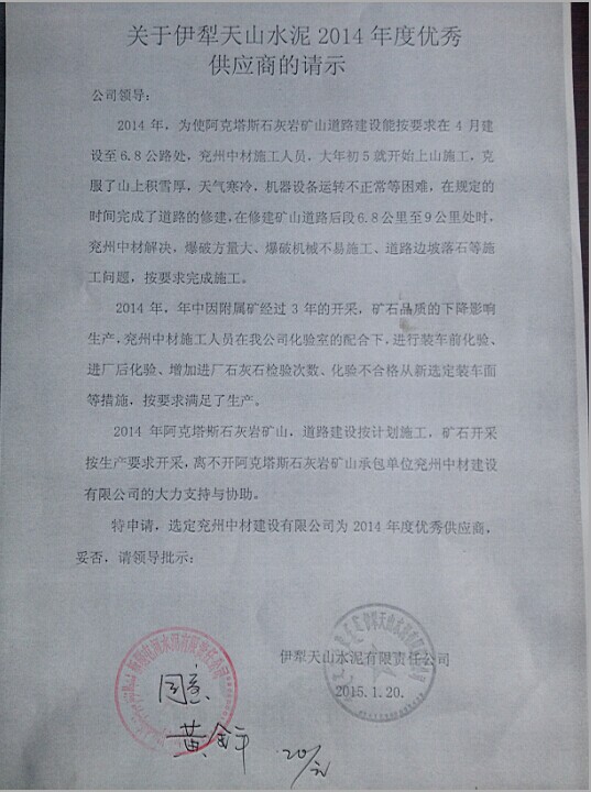 兗州中材建設(shè)有限公司被伊利天山水泥評為2014年度優(yōu)秀供應(yīng)商