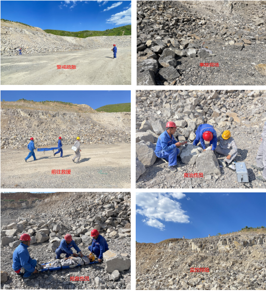 本次應(yīng)急演練事故假定:由于現(xiàn)場管理人員未發(fā)現(xiàn)挖裝區(qū)上部已有裂縫的邊坡,汽車駕駛員并將車輛停放在采場+1260平臺靠近邊坡處檢查車輛,未觀察周圍及邊坡穩(wěn)定情況,突然邊坡坍塌,將汽車駕駛員腿部砸傷,現(xiàn)場員工發(fā)現(xiàn)后立即上報現(xiàn)場負(fù)責(zé)人。