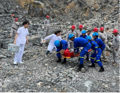 演練開始,總指揮張鵬收到現(xiàn)場有發(fā)生塊石滾落,造成現(xiàn)場技術(shù)員腿部受傷請求救援的緊急報(bào)告,立即下達(dá)指令啟動分公司應(yīng)急預(yù)案,并對本次救援進(jìn)行全面組織部署,對分公司警戒保衛(wèi)組、搶先救援組、醫(yī)療救護(hù)組、通訊聯(lián)絡(luò)組等下達(dá)指令,各小組在接到指令后立即響應(yīng)應(yīng)急預(yù)案,第一時間到達(dá)事故發(fā)生地,按秩序組織搶險救援,對傷員進(jìn)行緊急救治并對事故發(fā)生地進(jìn)行警戒隔離。