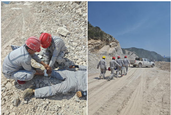 此次演練是模擬爆破后,爆破作業(yè)人員進(jìn)入爆破作業(yè)區(qū)域確定是否有無盲炮,由于爆破震動(dòng)產(chǎn)生巖體松動(dòng),爆破作業(yè)人員躲閃不及被落石砸傷,導(dǎo)致無法起身。事故發(fā)生后,分公司立即上報(bào)并啟動(dòng)放炮事故應(yīng)急預(yù)案,循序開展救援。